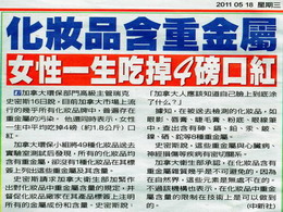 女性一生吃掉4磅口紅! 『化妝品含重金屬雜質幾乎是不可避免的,因為在自然界,這些元素是無所不在的。加拿大環保部門也表示,在化妝品中重金屬含量的限制在技術上是可以做到的。』