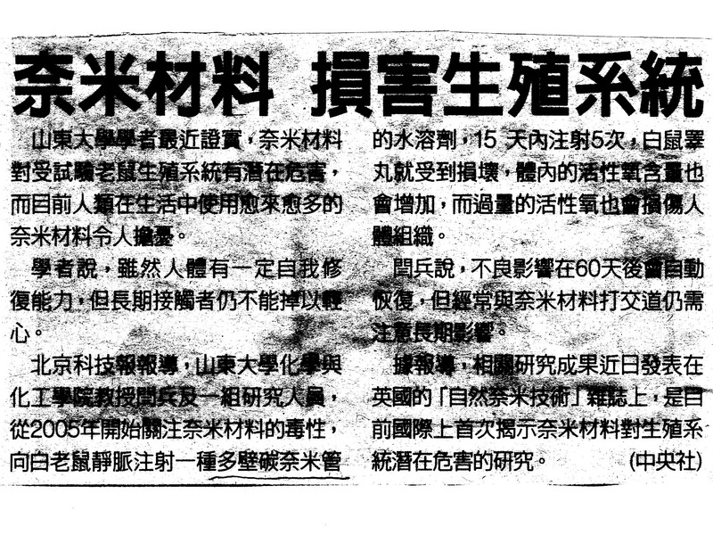 奈米材料使用於生活中愈來愈多,是否對環境和人體有危害??值得大家關心。 山東大學學者研究證實,奈米材料對受試老鼠生殖系統有潛在危害, 是國際上首次揭示奈米材料對生殖系統潛在危害的研究。 剪報資料2010.10.20 U-paper