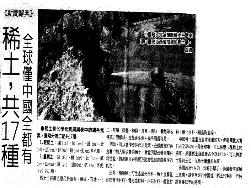 中國稀土產量占全球97%,蘊藏量占全球52%;